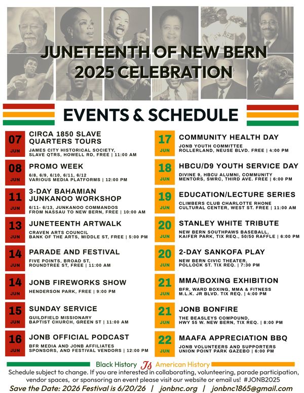 Thank you for being part of the 2025 Juneteenth of New Bern Celebration! Whether you joined us for a day or the entire 16-day experience, we want your feedback. Your responses help us make next year even better!
